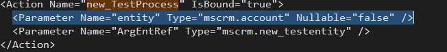 - Once downloaded, open up the metadata in Visual studio or any other XML editor of your choice. Search for your action. In this case – “new_TestProcess”.