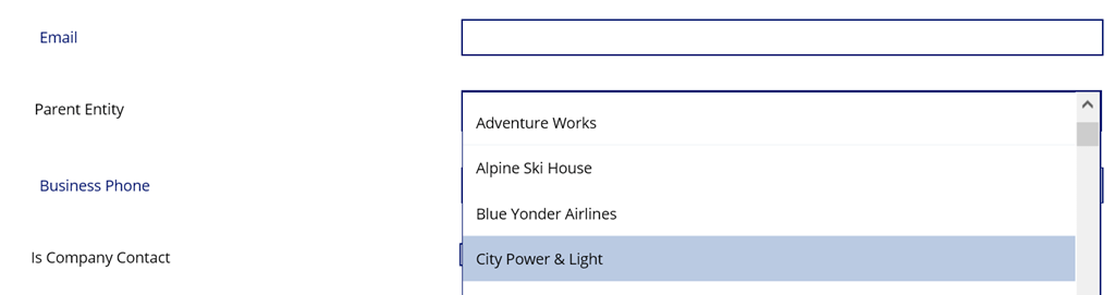 Parent Entity field is nothing but the Company name (parentcustomerid) field of the contact. “Is Company Contact” is a custom field of type boolean.