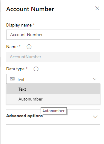 Below I open the OOB Account Number field and set the Data Type from Text to AutoNumber.