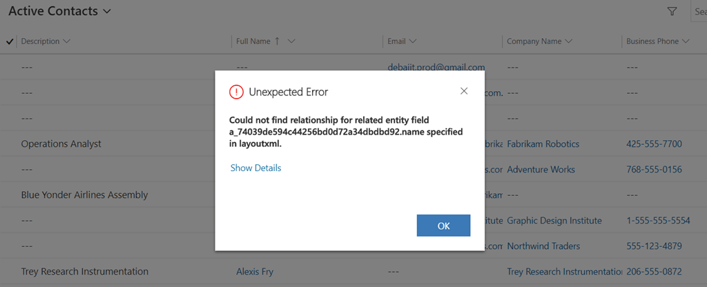 Then my next question was – Have you modified the view? The error clearly states that it is unable to find the related column name of Account Entity. And my guess was correct. They have added the Account Name field in the Active Contacts view from the parent Account entity. And they are using the OOB relationship only.