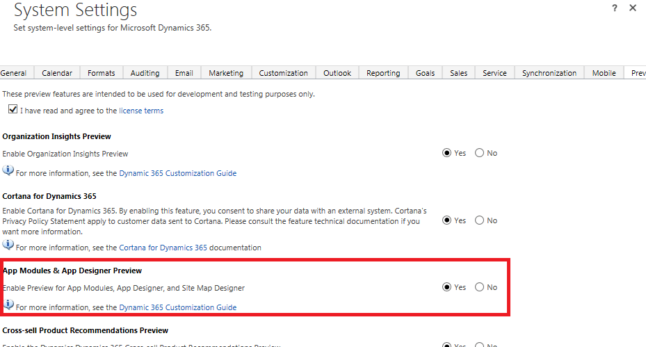 1. I just started a Dynamics 365 for Sales trial. However, I do not see the option to select “Yes” for “App Modules & App Designer Preview” in the “System Settings” dialog box (the first screen shot in your blog). Is there some special setting in my trial that first needs or is there some permissions or access level setting that my account needs to be enabled to see this? As a result, I am unable to see Application-My Apps, and hence unable to see the [+ CREATE APPS] button to open the App Designer. Do you know what I could be doing wrong?