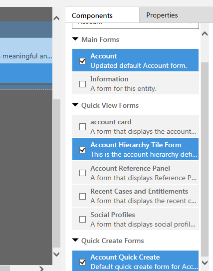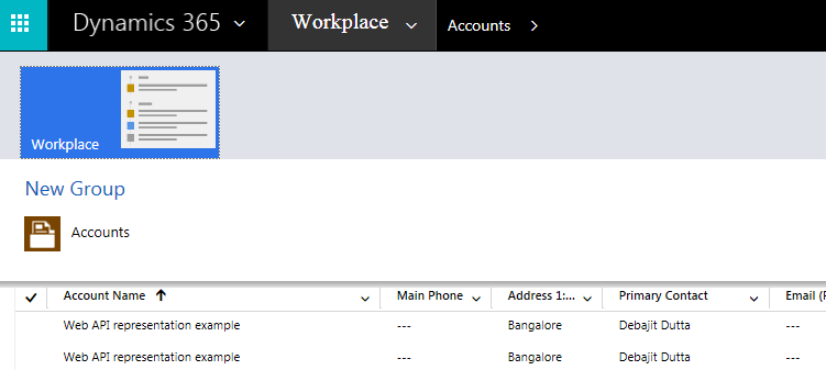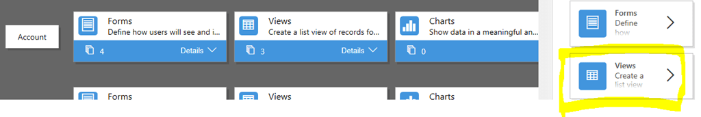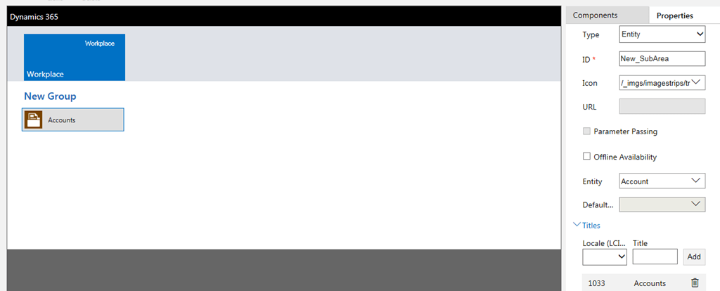 In the Workplace area, I am going to add the ‘Accounts’ entity. Select Type = Entity and in the Entity select “Account”.