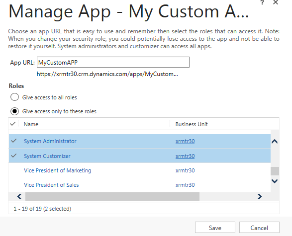 I have chosen the System Administration & System Customizer role who should be able to view my custom app.
