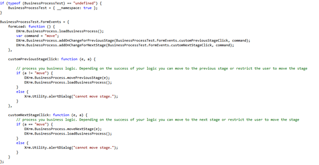 • Register you own custom event handlers when Next Stage and Previous stage is clicked in the business process flow.