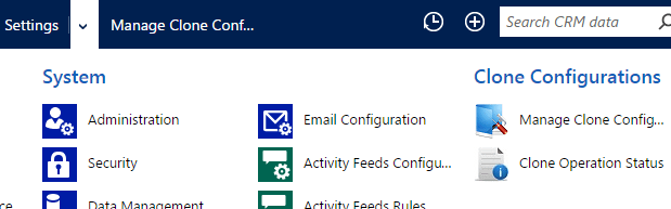 So let me give you a quick overview of how it works. The tool comes in the form of managed solution and once you install it, please navigate to Settings and under settings you should see the section – Manage Clone Configurations. Please note that the Manage Clone Configurations link would be visible only to system administrators.