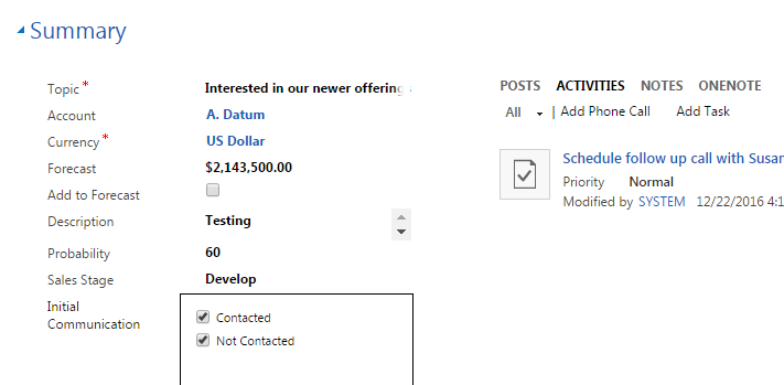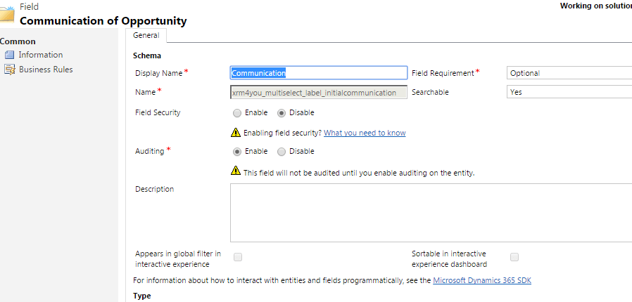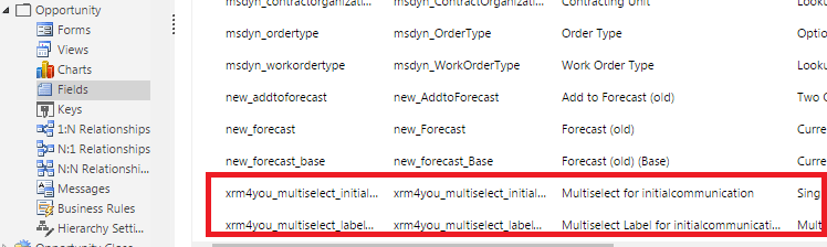 For example, I have a field called Display Name – Initial Communication (schema – initialcommunication) on the Opportunity entity which I have configured for multi-select behavior. Two additional fields get created