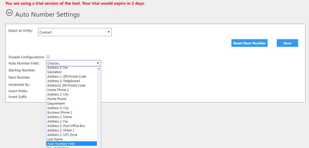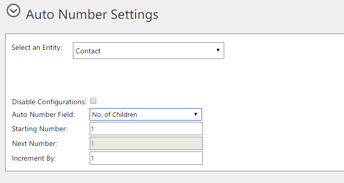- Disable configuration – By default, auto number configuration is enabled automatically once you select an entity and save your configurations in the tool. However you may choose to just disable the auto number for that entity without actually deleting your configurations that you took so much time to set-up.