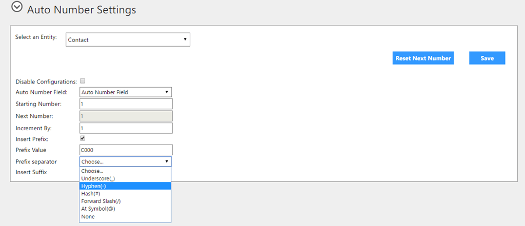 - Prefix Value – Since I am using Contact entity, say for example I prefer my auto number value to be prefixed with C000. You can just put this value in the prefix.