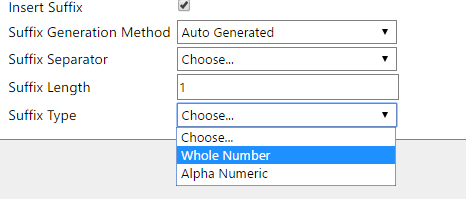 - Suffix Type – You can choose between Whole Number & Alpha Numeric depending on the business requirement. Please note that you would have no control on the number generated. All the system would guarantee that it won’t be more than the length specified in the ‘Suffix Length’ field.