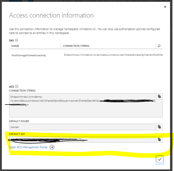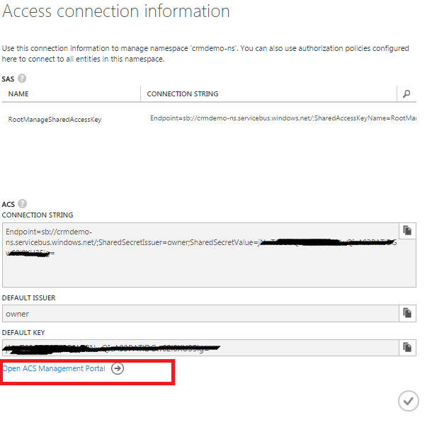 Open Azure Management Portal –> Service Bus –> Select your service bus –> Connection information (at the bottom of the screen). In the pop-window click on ‘Open ACS Management Portal’ at the bottom of the screen.