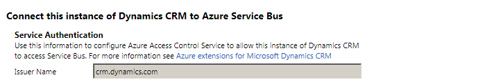 The name of the issuer. This name must be the same name that was used to configure Microsoft Dynamics CRM for Microsoft Azure integration. You can obtain the issuer name from the Developer Resources webpage mentioned in the previous description.