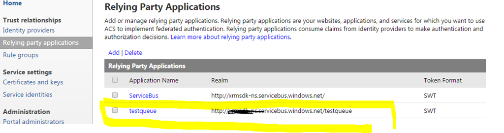 Once the ACS management portal opens, go to ‘Relying Party applications’. Remember in the first post of this series, I explained that Queue would be set-up to trust the ACS for authentication. This is what CRM plugin registration tool has done. It has create an entry for the Relying Party.