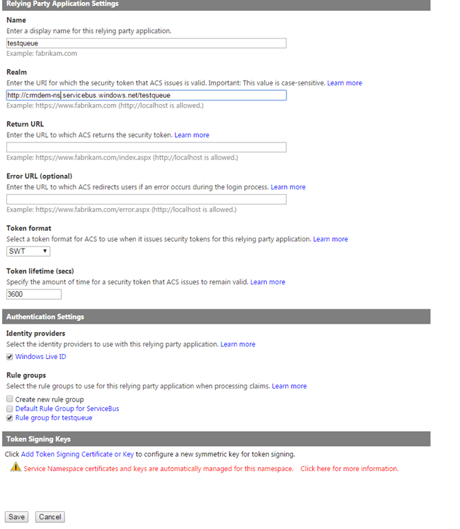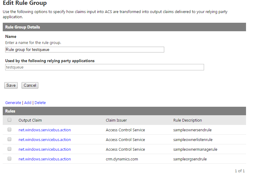 And then you have Rule Groups. Now these are the rules which dictates how the claims generated from Dynamics CRM identity provider are transformed into ACS token claims which is understood by the relying party. As you can as a part of the configuration process, Dynamics CRM has created a Rule group name ‘Rule group for testqueue’.
