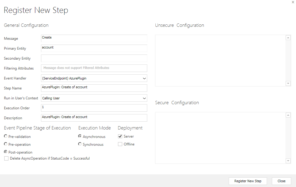 What we are basically doing here is on-post create of an account we are posting the context information to the Queue. Remember to mark it asynchronous. CRM will not allow you to register Synchronous step here.