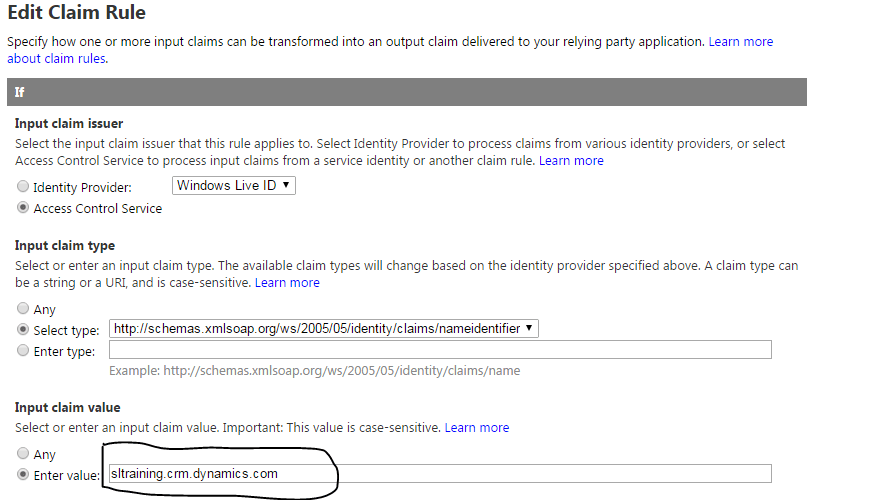 However check for the value of the Input claim. It is specified as owner. Here we just want this rule to execute only if the input claims are from Dynamics CRM. For this I will substitute this value with the unique name of my CRM organization which you can find in Settings –> Customizations –> Developer resources.