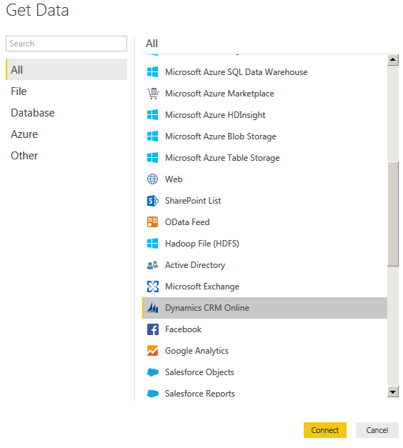 First of all, we need to understand the Power BI connecting string for Dynamics CRM. Microsoft Dynamics CRM comes as one of the listed data sources for Power BI. So let us choose that.