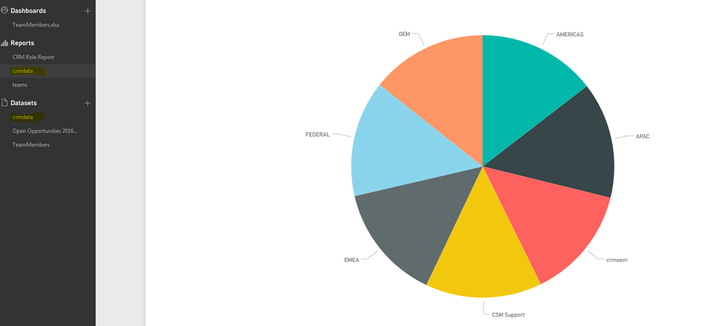 I save the file as crmdata.pbix. Then I go ahead to URL – https://app.powerbi.com and in Get Data –> Files-> Local File -> Upload the recently saved Power BI File. As you can see, now my Power BI workspace shows the report and the data set as well.