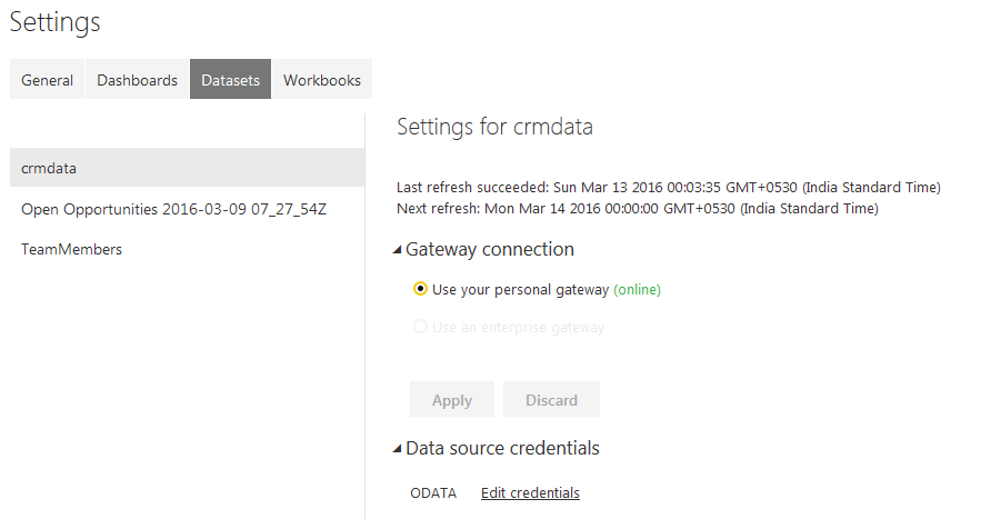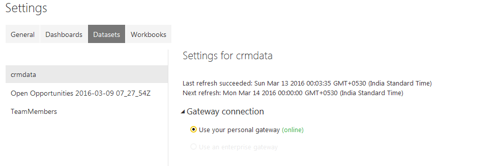 So now what. You have uploaded your on-premise report but how Power BI will refresh the report when the underlying data source changes in your on-premise CRM. For that you need to schedule refresh of the dataset – crmdata here. But how is that going to happen? After all how does Power BI, hosted in Cloud can connect to your data source? Well Microsoft have your back here. For this you would need to install the Power BI Personal Gateway.