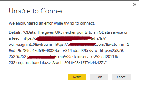 Not so good news here. Specially if your IFD is configured with a proxy server. And that is usually the case in most standard implementations. In these case once you enter the OData URL, you would receive an error like this in the Power BI