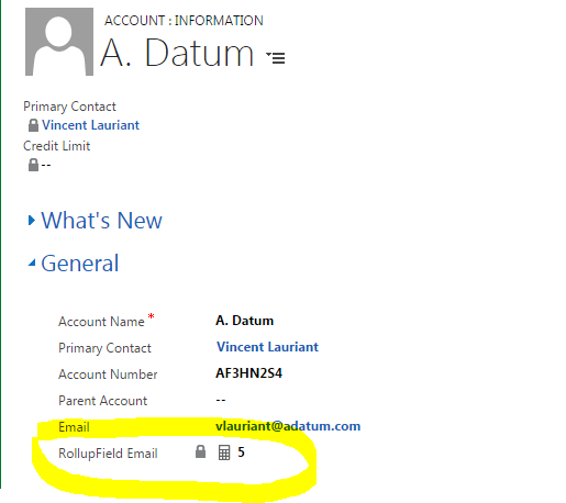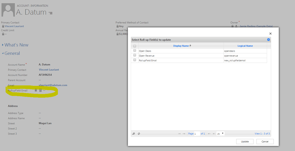 As you can see from the above screenshot, the pop-up shows the ‘RollupField Email’ which rolls up the count of emails related to the account. The other two fields ‘Open Deals’ and ‘Open Revenue‘ which are not present on the form but still showing up.
