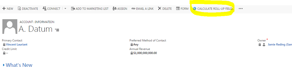 Once you install the managed solution in your environment, open any entity and you should see a button called ‘Calculate Roll-up Fields’