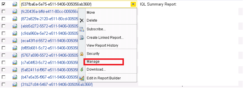 Now going back to the main topic, I select my report and from the report menu, click of manage and then click on datasources.