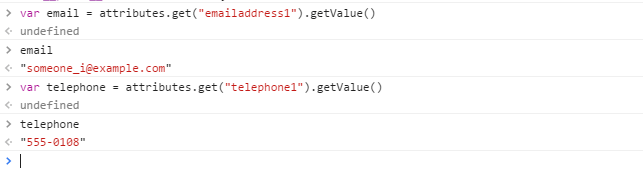 Let us take the above code only. Till we get the entity, we would use the same code. However to get the attributes of the entity, we will use the getAttributes method of the entity. So let see how this looks in the developer toolbar.