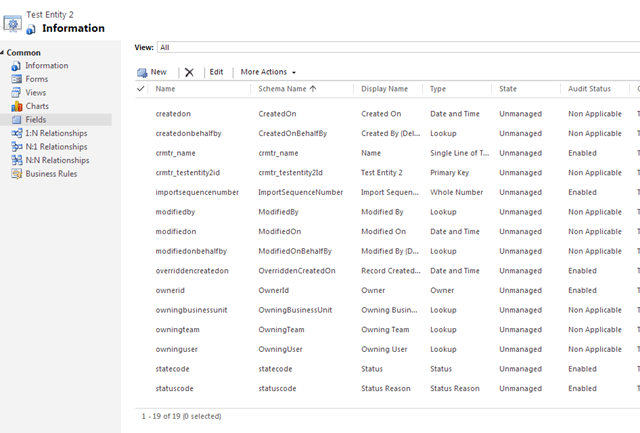 I have a custom entity called “Test Entity 2”. I have just created this entity and till now I haven’t created any custom field of the entity. If you check the screenshot below, you would find that as of now the entity has 19 fields.