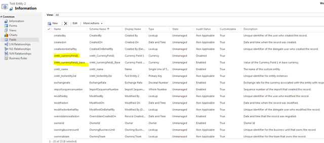 Now I create a new currency field called “Currency field 1”. As soon as I create this, the system creates two additional fields one to hold the base currency value and the other to hold the currency value that we are using for our application. This is perhaps we all know. Look for the screenshot below. the name of the fields are “crmtr_currencyfield1” and “crmtr_currencyfield1_base”