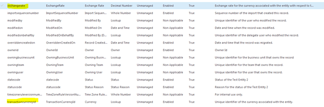 When we create a currency field for the first time, then additional two fields also gets created. One is “exchangerate” which is of type “Decimal”. And the other is transactioncurrencyid lookup field. Check for the screenshot below. Please note that these two additional fields are created only for the first time when a currency field in created for the entity. If we add another field, then from the next time onwards only two fields are created.