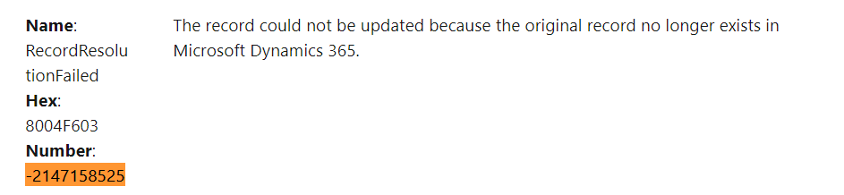 And if you open the link, you can see the error code right there in the list. As you can see the error happen when you try to import a record which no longer exist in Dynamics 365.
