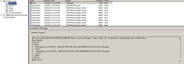 Once we save the configuration, we now again try to create the account. If you are continuing from the previous article, please note that I have enabled back the pre-account step of the plugin for logging. Once the create operation is completed, we open the event viewer and check. Following is the screenshot of what we have in the event viewer.