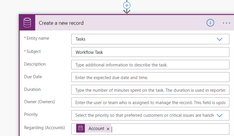 In the next step I am creating a task with the same Common Data Service (Current Environment) and set the Regarding to account created in previous step.